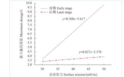 圖8為估算出的蘋(píng)果樹(shù)葉片分別在生長(zhǎng)前期和后期施藥的最大藥液量與藥液表面張力的關(guān)系。從中可以看出,在試驗(yàn)果園中,在蘋(píng)果樹(shù)生長(zhǎng)前期施藥的最大施用量受藥液表面張力的影響大于在生長(zhǎng)后期施藥。