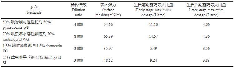 表3為4種常用農(nóng)藥制劑在推薦使用倍數(shù)下對(duì)蘋(píng)果樹(shù)的最大施藥量。從表中可以看出,在蘋(píng)果樹(shù)生長(zhǎng)前期施藥的最大用量遠(yuǎn)高于在生長(zhǎng)后期施藥??紤]到目前果園中使用的大容量噴霧器械多為手持柱塞泵式機(jī)動(dòng)噴霧機(jī),霧滴粒徑均一性較差,加之人為因素可能導(dǎo)致的藥液無(wú)法均勻覆蓋全樹(shù),再結(jié)合張鵬九等在關(guān)于不同藥械防治蘋(píng)果園桃小食心蟲(chóng)影響的研究中每株樹(shù)推薦使用藥液量為3.5 L,得出在果樹(shù)前期推薦藥液的表面張力應(yīng)在35 mN/m以下,后期應(yīng)在60 mN/m以上,便于實(shí)際操作。