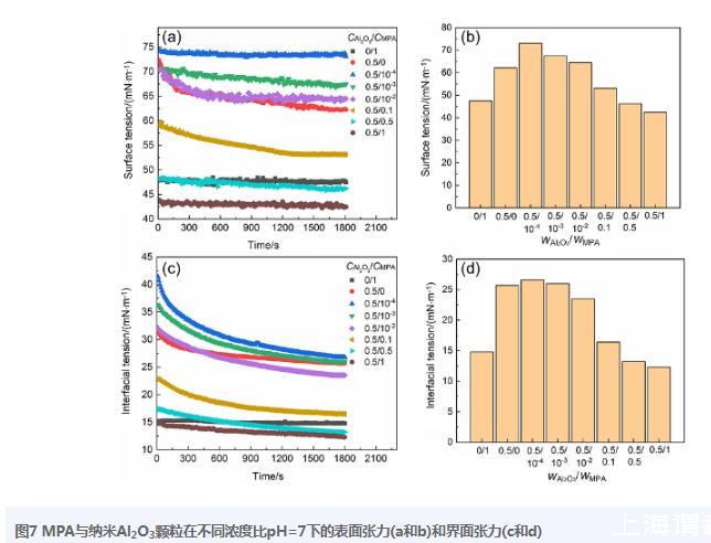 圖7 MPA與納米Al2O3顆粒在不同濃度比pH=7下的表面張力(a和b)和界面張力(c和d)