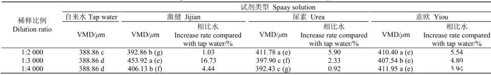 注:數(shù)字后不同字母表示同1行不同溶液間差異顯著(<0.05),括號內(nèi)字母表示同1列數(shù)值顯著性差異(<0.05)。VMD:霧滴體積中徑。下同。