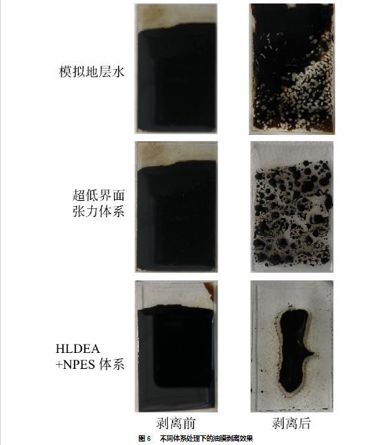 超低界面張力體系具有一定的潤(rùn)濕調(diào)控性能,可以剝離44.2%的表面油膜,但其油膜剝離效率較差,剝離油膜僅在局部發(fā)揮作用,未能實(shí)現(xiàn)油膜的整體剝離,剝離后表面殘余油膜呈斑點(diǎn)狀。HLDEA+NPES體系的油膜剝離效率(75.3%)遠(yuǎn)高于模擬地層水(24.8%)和超低界面張力體系(44.2%)。HLDEA+NPES體系中HLDEA分子作用于油固界面,改變親油表面潤(rùn)濕性,有利于油膜收縮;NPES分子作用于油水界面,改變了油水界面的性質(zhì),使得油滴容易變形并脫離玻璃表面,降低了油滴的形變阻力,提高了油膜剝離率。
