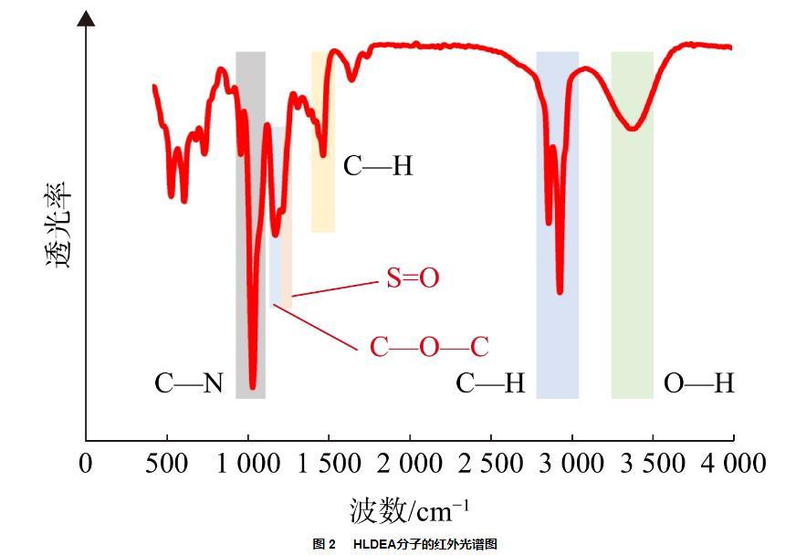 紅外光譜中峰的位置及形狀與分子中鍵的種類和環(huán)境具有對(duì)應(yīng)關(guān)系,通過分析所得譜圖可得到物質(zhì)的化學(xué)和結(jié)構(gòu)組成的相關(guān)信息。圖2所示為HLDEA分子的紅外光譜圖。由圖2可知,合成后的HLDEA在3354.44 cm?1處出現(xiàn)O—H鍵的伸縮振動(dòng)峰,2921.96 cm?1和2852.77 cm?1處的雙峰代表C—H鍵的伸縮振動(dòng)峰,1463.05 cm?1處出現(xiàn)C—H鍵的彎曲振動(dòng)峰,1028.50 cm?1處出現(xiàn)C—N鍵的伸縮振動(dòng)峰,1215.97 cm?1處出現(xiàn)了S=O鍵的伸縮振動(dòng)峰及1168.25 cm?1處C—O—C鍵的伸縮振動(dòng)峰。C—O—C鍵和S=O鍵對(duì)應(yīng)的振動(dòng)峰來自生成的醚鍵和引入的磺酸根,這兩處峰的存在證明了反應(yīng)成功發(fā)生,磺酸基團(tuán)被接到LDEA分子上。