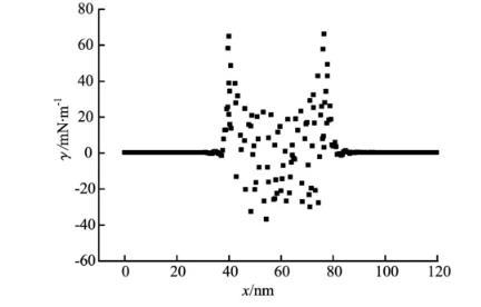 模擬水分子數(shù)N1=3 000,十二烷基硫酸鈉數(shù)N2=20,溫度T=300 K,水—表面活性劑體系的局部界面張力見圖10。由圖10可知,從汽相主體向液相過(guò)渡過(guò)程中,界面張力值逐漸增加,在氣—液界面區(qū)達(dá)到峰值;在液相主體又在零值附近波動(dòng)。