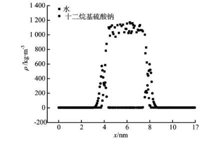 向純水中加入十二烷基硫酸鈉表面活性劑,水分子3 000個(gè),十二烷基硫酸鈉20個(gè),模擬得到300 K下水—表面活性劑體系的密度分布,如圖8所示。由圖8可見,對(duì)于只有水的體系來(lái)說(shuō),其密度變化基本是符合由汽相到液相逐漸增加的趨勢(shì),而對(duì)于加入的表面活性劑十二烷基硫酸鈉的體系來(lái)說(shuō),其密度的變化情況與只有水的體系有明顯的不同。從圖8可以看出,在氣—液兩相的過(guò)渡區(qū)域,加表面活性劑的體系密度出現(xiàn)明顯的增長(zhǎng)。