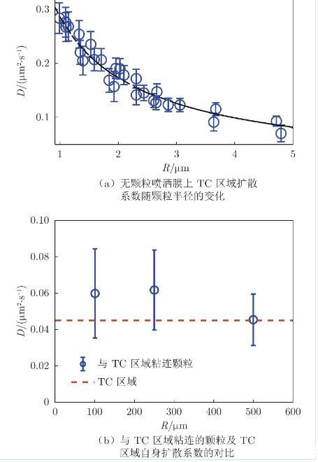 均為常數(shù),取自文獻(xiàn)。肺表面活性劑單層膜厚度為1 nm,由此可得膜的體黏度為0.77 Pa·s,是純水黏度的770倍。圖9(b)將與TC區(qū)域粘連的顆粒的擴(kuò)散系數(shù)(以圓形表示)與單獨(dú)TC區(qū)域的擴(kuò)散系數(shù)(以虛線表示)進(jìn)行了對(duì)比,后者選取3.5μm為平均TC區(qū)域直徑(參照?qǐng)D2照片),由HPW模型代入計(jì)算得出??梢钥闯?,在實(shí)驗(yàn)統(tǒng)計(jì)誤差范圍內(nèi),二者近似相等,表明顆粒與TC區(qū)域形成的整體受力主要來(lái)自于TC區(qū)域。TC區(qū)域直徑遠(yuǎn)大于顆粒直徑,膜內(nèi)黏滯阻力更大;此外,膜的體黏度遠(yuǎn)大于水相,因此水相對(duì)顆粒浸沒(méi)部分施加的黏滯阻力可忽略不計(jì)。