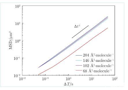 在LE相表面均勻的膜上,均方位移MSD隨時(shí)間間隔Δt線性增長(zhǎng)(圖4),阻力系數(shù)由愛因斯坦關(guān)系
