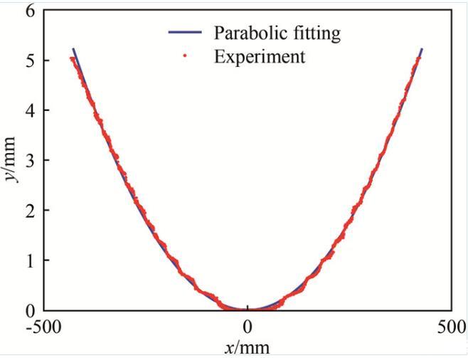 為驗(yàn)證曲線方程(10),在砝碼質(zhì)量m=0.2 kg、皂液流量Q=35 mL/min時(shí),實(shí)測(cè)了穩(wěn)態(tài)流動(dòng)皂膜狀態(tài)下尼龍繩的位置坐標(biāo),如圖2中的離散點(diǎn)所示。尼龍繩位置通過照相得到,為獲得較大范圍內(nèi)的圖像,采用的放大倍數(shù)為1個(gè)像素對(duì)應(yīng)0.35 mm的物理尺寸。對(duì)尼龍繩圖像在水平方向的光強(qiáng)分布進(jìn)行高斯函數(shù)擬合以獲得亞像素的定位精度。圖2中的光滑曲線是采用式(10)進(jìn)行擬合的結(jié)果,與實(shí)測(cè)曲線吻合良好,驗(yàn)證了分析的正確性。利用已知的砝碼質(zhì)量,可以進(jìn)一步得到表面張力系數(shù)γ=27.5 mN/m。值得注意的是:當(dāng)砝碼質(zhì)量很小時(shí),表面張力引起的流道收縮很大(在中點(diǎn)O處達(dá)到最大值12%),為避免由此帶來的流速和厚度場(chǎng)改變,在流動(dòng)皂膜實(shí)驗(yàn)中一般使用m=2 kg的砝碼。