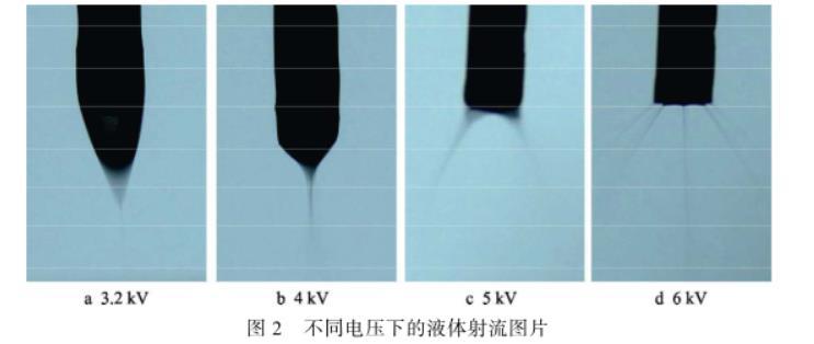 電壓越高,液體霧化成的液滴越細(xì)小。隨著電壓的升高,液滴霧化的射流狀態(tài)大致可以分為三種:滴狀模式、錐射流模式和多股射流模式。在較小的電壓(0~3 kV)下,噴嘴處液體所受的電場力小于表面張力,噴嘴中液體以滴狀形態(tài)落下,為滴狀模式。電場力逐漸增大,噴嘴液體被拉成細(xì)長軸狀,形成連續(xù)的射流。進(jìn)一步增大電壓(如圖2a、b所示),液體在噴嘴處形成錐狀,且破碎成小霧滴,為錐射流模式,如圖2b所示,射流狀態(tài)最穩(wěn)定。