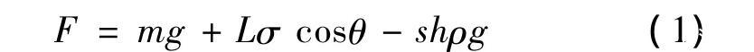 式中:F為平衡力,N;m為感測(cè)白金板的重量,kg;s為感測(cè)白金板橫截面面積,m2;h為浸入待測(cè)溶液的深度,m;L為感測(cè)白金板周長(zhǎng),m;σ為待測(cè)溶液的表面張力,mN/m;g為重力加速度,N/kg;θ為待測(cè)溶液和白金板的接觸角,°;ρ為待測(cè)溶液的密度,kg/m3。