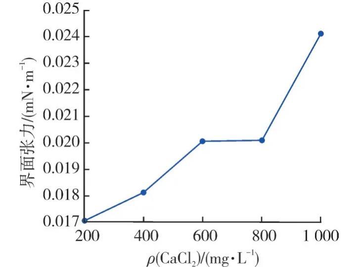 由圖4和5可知:隨著Na+濃度的增加,復(fù)配體系的油水界面張力值雖然不斷上升,但是當(dāng)?shù)V化度上升至50 000 mg/L時(shí),界面張力值增幅很小,僅增加了0.008 mN/m。當(dāng)Ca2+質(zhì)量濃度增加至1 000 mg/L時(shí),界面張力值增幅也很小,僅上升了0.007 mN/m。這兩種現(xiàn)象證明了隨著礦化度的增加,復(fù)配體系仍然具有較好的抗鹽性能,這也正是非離子表面活性劑的特點(diǎn)。