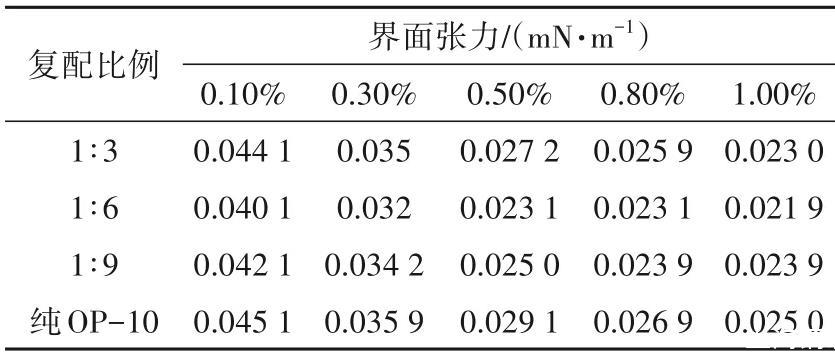 將HPAM配制成質(zhì)量分?jǐn)?shù)為0.10%的水溶液,與不同濃度的OP-10按不同比例復(fù)配,并測定不同復(fù)配體系的界面活性,結(jié)果見表3。