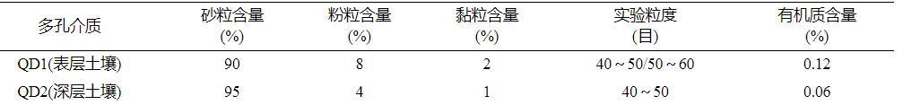 本研究選用的兩種多孔介質分別為QD1(表層20~40cm土壤)和QD2(地下50~100cm深層土壤),均采自青島市嶗山區(qū)某農(nóng)田。經(jīng)過自然風干后,將其篩分為40~50目和50~60目。實驗選用土壤中的金屬氧化物含量均較低,主要差異為有機質含量。土壤樣品的性質見表1。