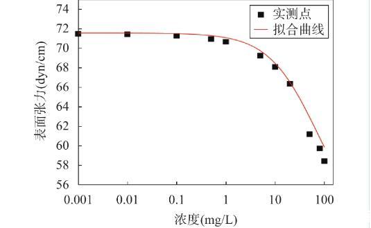 在0.01mol/L氯化鈉溶液中測(cè)量所得的6∶2氟調(diào)磺酸表面張力如圖1所示,圖中實(shí)心點(diǎn)表示同一濃度下表面張力的實(shí)際平均值,曲線是基于Szyszkowaki方程擬合所得。利用該方程擬合的相關(guān)參數(shù)A和B的值分別為12.70和0.075。實(shí)驗(yàn)結(jié)果顯示實(shí)測(cè)數(shù)據(jù)點(diǎn)與擬合曲線偏移量較小,這證實(shí)了Szyszkowaki方程對(duì)本實(shí)驗(yàn)體系的表面張力數(shù)據(jù)具有良好的擬合效果。