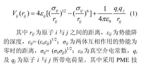 在計算過程中,綜合考慮了系統(tǒng)內分子間非鍵結作用力(范德華力、庫倫靜電力)及分子內鍵結作用力(鍵拉伸和鍵彎曲)。分別采用Lennard-Jones勢能函數(shù)模擬范德華力,庫侖定律模擬庫侖靜電力,具體分子間勢能函數(shù)如式(1)所示