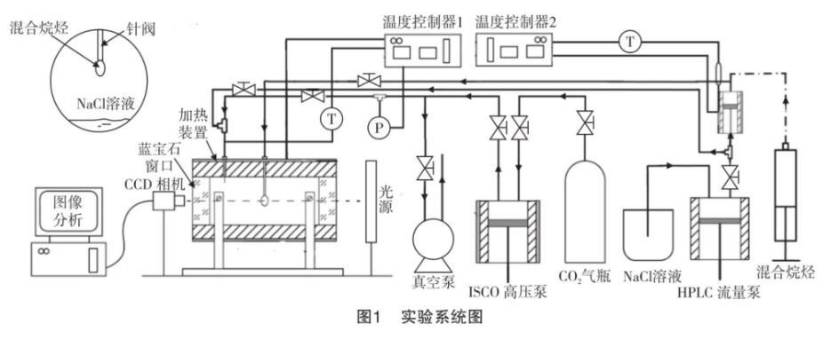 本實(shí)驗(yàn)所測量的CO2與混合烷烴的界面張力需模擬實(shí)際油藏的地層環(huán)境,即高溫高壓,且有地下鹽水層的存在。為此,設(shè)計(jì)了如圖1所示的實(shí)驗(yàn)系統(tǒng)以實(shí)現(xiàn)這一目標(biāo)。該系統(tǒng)從實(shí)驗(yàn)原理上主要分為照明系統(tǒng)、圖像采集系統(tǒng)和圖像分析系統(tǒng);從測試材料上主要分為進(jìn)液系統(tǒng)、進(jìn)氣系統(tǒng)和進(jìn)鹽水系統(tǒng);從實(shí)驗(yàn)環(huán)境上主要分為氣體測壓系統(tǒng)、氣體控溫系統(tǒng)和液體控溫系統(tǒng)。實(shí)驗(yàn)用材料來源及純度見表1,烷烴的組分模擬伊朗西南部的阿瓦茲-班吉斯坦(Ahwaz-Bangestan)油田原油的成分,不考慮瀝青質(zhì),摩爾分?jǐn)?shù)分別為:正庚烷8.93%,正辛烷9.02%,正癸烷5.26%,正十一烷5.72%,正十二烷71.07%。NaCl溶液的質(zhì)量分?jǐn)?shù)為17.33%。實(shí)驗(yàn)中將CO2與鹽水溶液飽和后,測其與混合烷烴的界面張力。