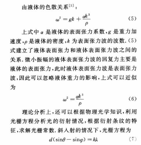 d為光柵常數(shù),在此情況下,光柵常數(shù)即為液體表面張力波的波長(zhǎng),θ為斜入射角,φ為衍射角,k為衍射級(jí)次,λ為光波的波長(zhǎng)。通過測(cè)量觀測(cè)距離、衍射條紋的間距等量可求出衍射角和光柵常數(shù)。再根據(jù)液體的色散關(guān)系(5)式,求得液體表面張力。具體的測(cè)量和求解過程,這里不再贅述。