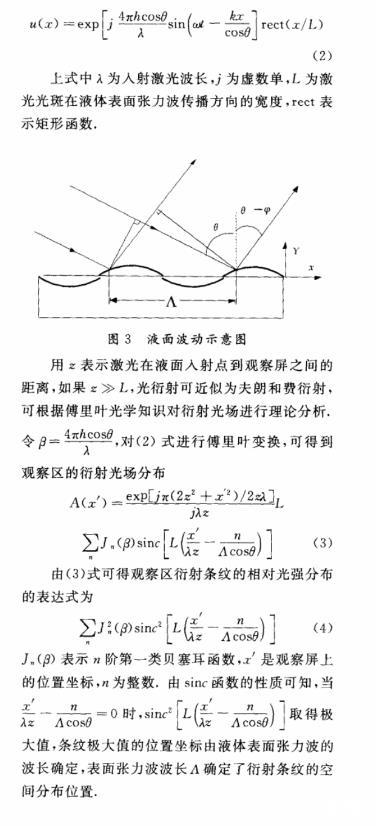 (2)理論上分析了表面張力波的光衍射效應(yīng),得到了衍射光場(chǎng)的解析表達(dá)式。根據(jù)衍射光場(chǎng)和表面張力波之間的關(guān)系,進(jìn)一步可求得液體的表面張力系數(shù)。