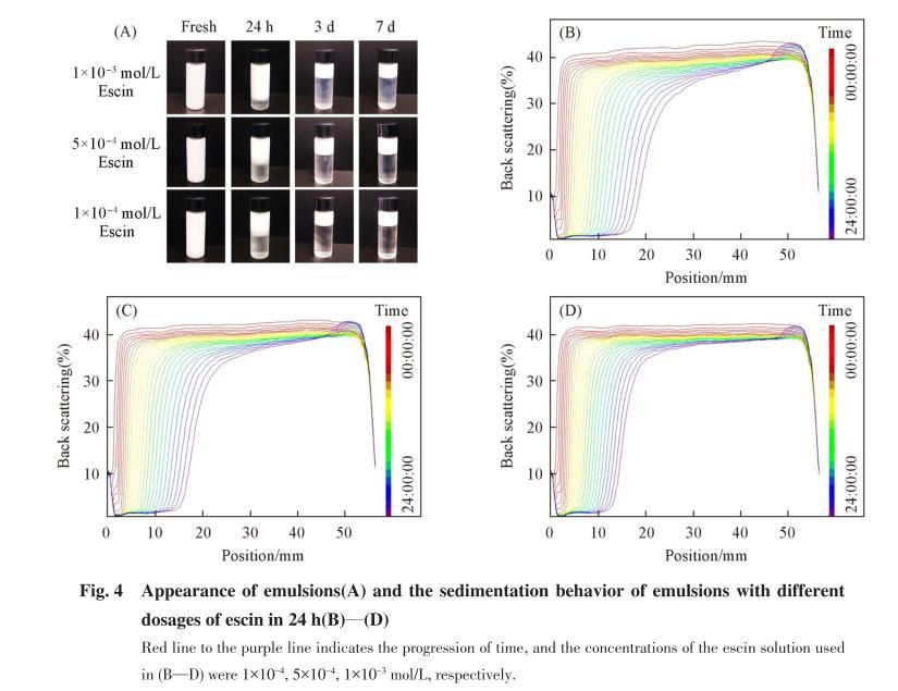 根據(jù)分散體系的光散射原理,當(dāng)光線射向乳液樣品時(shí),會(huì)發(fā)生散射,通過(guò)儀器由乳液底部到頂部掃描檢測(cè)背散射光的強(qiáng)度,即可快速分析乳液的聚結(jié)、分層等現(xiàn)象。據(jù)此,采用MS20型乳液穩(wěn)定性分析儀測(cè)定了不同濃度七葉皂素乳液在24 h內(nèi)的穩(wěn)定性,如圖4(B)~(D)所示.隨著時(shí)間延長(zhǎng),乳液下半部分背散射率呈明顯減小趨勢(shì),同時(shí)頂部背散射率逐漸增大,反映了下層析水,油相上浮的分層問(wèn)題.而隨著七葉皂素濃度增加,下部背散射率的變化值明顯減小。
