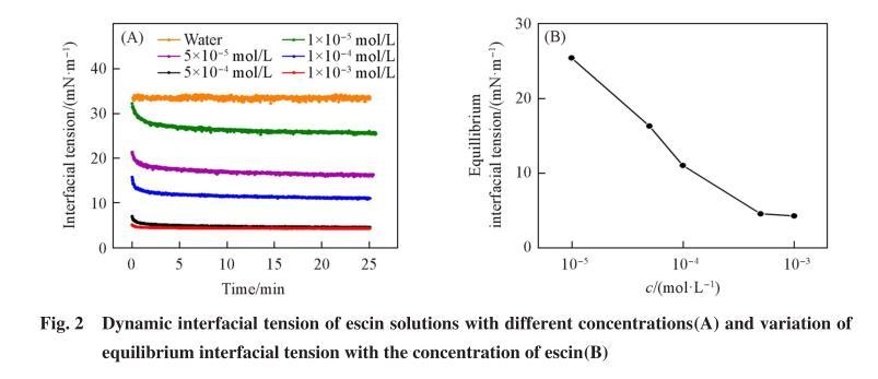 使用視頻光學(xué)接觸角測(cè)量?jī)x,利用懸滴法測(cè)定溶劑油150#和不同濃度七葉皂素溶液的油-水界面張力.溶液為內(nèi)相,溶劑油150#為外相.將七葉皂素溶液置于氣密性良好的注射器(針管外徑為1.65 mm)中,利用步進(jìn)馬達(dá)將溶液(8μL)注射到裝有溶劑油150#的玻璃皿中,CCD攝像機(jī)同步記錄測(cè)定過(guò)程的液滴狀態(tài)(每次測(cè)定25 min),軟件通過(guò)液滴形狀分析計(jì)算出界面張力.分別測(cè)定超純水以及不同濃度七葉皂素溶液與溶劑油150#的界面張力,每個(gè)樣品重復(fù)測(cè)3次.