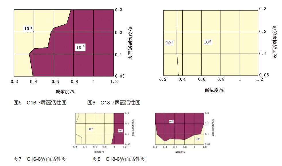 1)碳鏈長度對界面活性的影響對用濃度為1500mg/L的聚合物和不同碳鏈長度的烷基苯磺酸鹽配置的弱堿三元復(fù)合體系進行界面活性檢測(見圖5~圖8)。圖5和圖1對比表明,帶有支鏈的C16烷基苯磺酸鹽形成超低界面張力時堿濃度和表面活性劑濃度范圍較寬;圖6和圖4對比表明,帶有支鏈的C18烷基苯磺酸鹽在相同濃度范圍內(nèi)沒有形成超低界面張力。因此,帶有支鏈的C16烷基苯磺酸鹽界面活性好于帶有支鏈的C18烷基苯磺酸鹽。