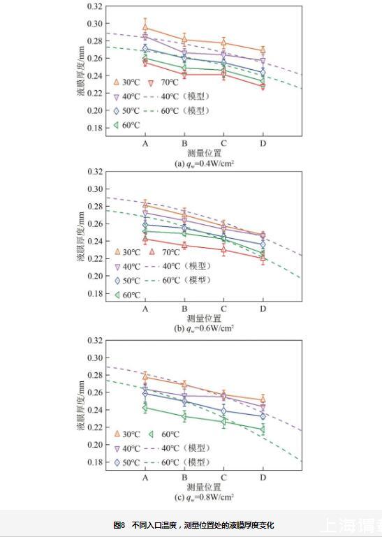在加熱條件下,由于液體入口溫度不斷提升以及流經(jīng)正在加熱壁面上,液膜將會(huì)產(chǎn)生水蒸氣冷凝在探針頭部,從而影響通過攝像機(jī)觀測液膜氣液界面的判斷。本實(shí)驗(yàn)中,在探針底部粘貼一塊直徑為9mm的陶瓷加熱片,在加熱傾斜壁面的同時(shí)也加熱探針,避免水蒸氣凝結(jié)在探針頭部影響對液膜厚度的測量。為了觀測到傾斜加熱壁面上液膜出現(xiàn)干斑現(xiàn)象,減小去離子水的噴淋密度,但仍然確保液膜能夠完全鋪展在壁面上。圖8展示了在壁面傾斜角度為15°、噴淋密度為0.016kg/(m·s)的條件下,不同熱流密度和入口溫度對各測量位置液膜厚度變化的影響,并與模型計(jì)算值進(jìn)行了對比。當(dāng)入口溫度為70℃、熱流密度qw=0.8W/cm2時(shí),液膜厚度變化消失,由于加熱壁面出現(xiàn)了干斑。