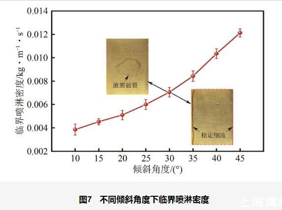 從圖7中可以看出,在較低的傾斜角度(如10°~25°)下,液膜受重力在壁面平行方向分量的影響較小,主要依靠噴淋液體的動(dòng)能和潤濕性來維持覆蓋。此時(shí),液膜較厚,表面張力對毛細(xì)波動(dòng)的抑制作用較強(qiáng),能夠有效抵御擾動(dòng),流動(dòng)較為穩(wěn)定,因此臨界噴淋密度較低。然而,在較高的傾斜角度(如30°~45°)下,重力在流動(dòng)方向的分量顯著增強(qiáng),液膜受到更大的重力驅(qū)動(dòng)力作用,易發(fā)生滑移和局部脫離壁面現(xiàn)象。同時(shí),傾斜角度增大會(huì)使液膜變薄,液膜內(nèi)剪切力增大,進(jìn)一步放大表面張力波動(dòng)對擾動(dòng)的響應(yīng),從而導(dǎo)致液膜對擾動(dòng)的敏感性提高,流動(dòng)不穩(wěn)定性顯著增強(qiáng)。此外,局部區(qū)域的液膜破裂會(huì)導(dǎo)致液膜整體失穩(wěn),最終在兩側(cè)形成穩(wěn)定細(xì)流。因此,為了維持液膜的完整性和連續(xù)性,需要提高噴淋密度以抵消重力和表面張力波動(dòng)的破壞作用,從而導(dǎo)致臨界噴淋密度在高傾斜角度下顯著升高。