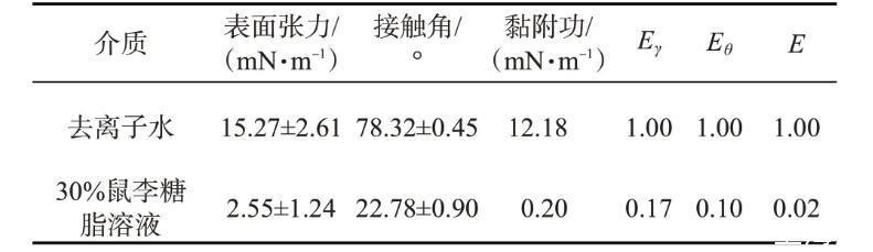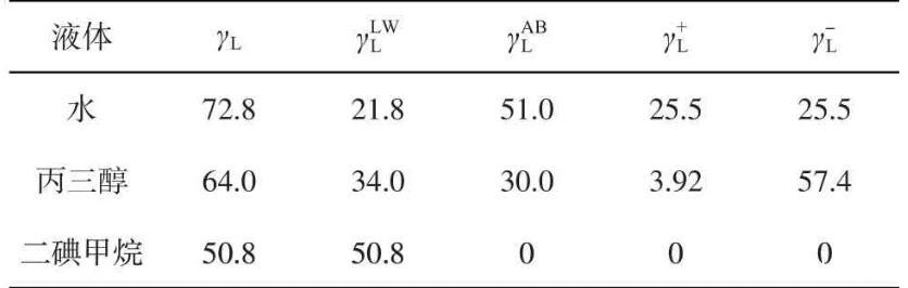 基于接觸角測量法中的LW-AB法,參考韓玉香等的研究,首先分別測試3種溶液(去離子水、丙三醇和二碘甲烷)在親油玻片及30%鼠李糖脂溶液處理后的親油表面的接觸角;然后結(jié)合3種溶液的表面張力及其分量值(表1),按照參考文獻(xiàn)中式1-38至式1-42,分別測算固體的表面能中Lifshits-van der waals分量、以及Lewis酸分量和堿分量;最后按照參考文獻(xiàn)中式1-37計(jì)算親油玻片及30%鼠李糖脂溶液處理后的親油表面自由能γS。
