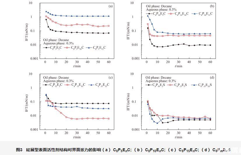 EO基團(tuán)為弱親水基團(tuán),界面上表面活性劑分子的EO鏈傾向于伸入水相。當(dāng)EO鏈過長時,整個表面活性劑分子呈現(xiàn)兩頭大、中間細(xì)的“啞鈴”狀結(jié)構(gòu),影響界面吸附膜的緊密程度,造成界面張力升高。根據(jù)羧酸鹽型延展型表面活性劑的結(jié)構(gòu)-活性關(guān)系認(rèn)識,選擇可能具備超低界面張力活性的硫酸鹽型延展型表面活性劑(C8P10E5S、C8P15E5S、C8P15E10S)進(jìn)行界面張力測試,實驗結(jié)果見圖3d。與羧酸鹽類似,上述硫酸鹽型延展型表面活性劑均能將正癸烷的界面張力降至超低??傊渥愕腜O數(shù)和少量的EO數(shù)是延展型表面活性劑獲得超低界面張力的先決條件。