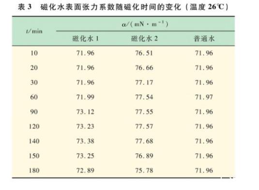 表3磁化水表面張力系數(shù)隨磁化時(shí)間的變化(溫度26℃)