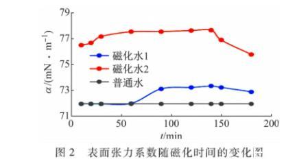 (1)從圖表可以看出,磁化水2在最初的前60 min內(nèi)表面張力系數(shù)有了較大的變化,最大差值為7.8%