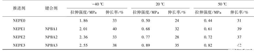 分別在-40℃、20℃、50℃溫度條件下,采用單向拉伸實驗得到了含與不含NPBA推進劑的最大拉伸強度σm和最大伸長率εm,其結果見表6.