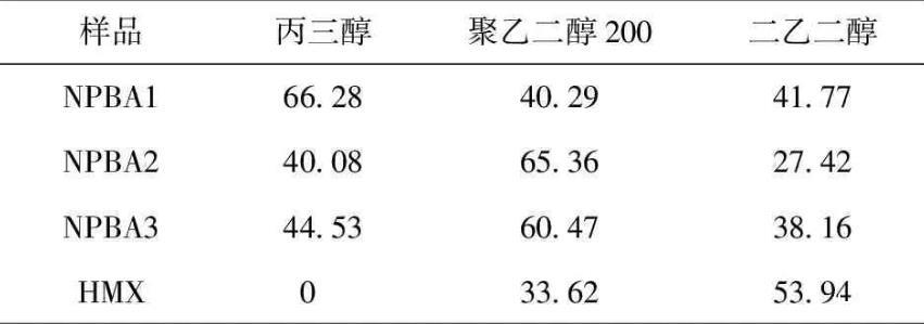 由表5可知,NPBA3與HMX的粘附功最大(113.34 mN/m),且界面張力最小(4.81 mN/m),表明3種NPBA中NPBA3與HMX的浸潤性(粘結性)最好,且外力破壞粘接界面需做的功(粘結強度)最大。與NPBA1相比,雖然NPBA2與HMX的粘附功相對較大(分別為75.06 mN/m和78.38 mN/m),但其界面張力相對也大(分別為21.51 mN/m和24.12 mN/m),表明NPBA2與HMX的粘結強度大于NPBA1,但浸潤性略弱。