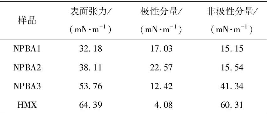 采用動態(tài)接觸角測試儀的Wilhelmy吊片法和Modified washburn法,分別測試了合成的3種NPBA和HMX在不同液體中的接觸角θ,結果見表3.