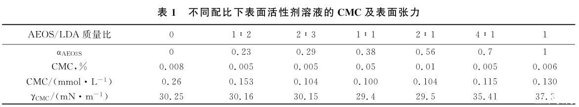 在25℃測(cè)試了AEO3S和烷醇酰胺LDA表面活性劑及其在不同質(zhì)量配比下溶液的表面張力,實(shí)驗(yàn)結(jié)果見(jiàn)圖1。根據(jù)相對(duì)分子質(zhì)量計(jì)算出表面活性劑AEO3S的摩爾分?jǐn)?shù)(αAEO3S)。由圖1中濃度與表面張力的關(guān)系得到溶液的CMC及對(duì)應(yīng)濃度下的表面張力,實(shí)驗(yàn)結(jié)果見(jiàn)表1。