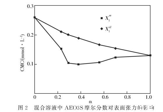 圖2混合溶液中AEO3S摩爾分?jǐn)?shù)對表面張力的影響