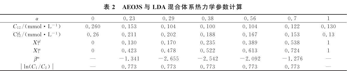 表2 AEO3S與LDA混合體系熱力學(xué)參數(shù)計算