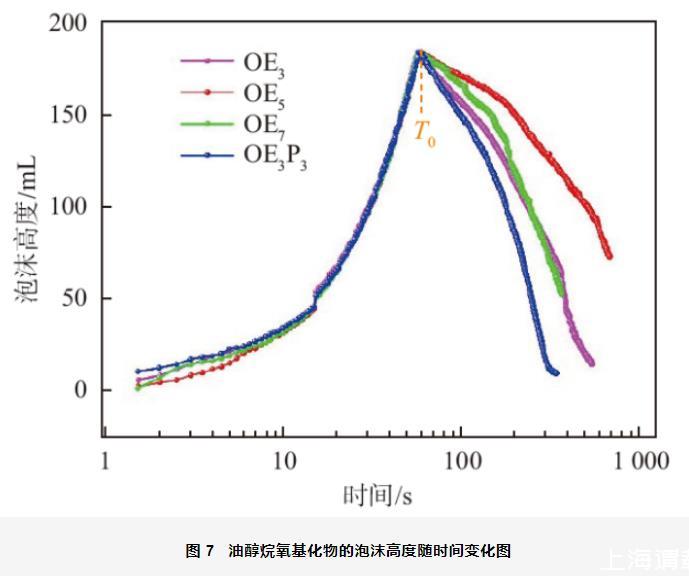 起泡性和穩(wěn)泡性是表面活性劑泡沫性的兩個非常重要的特征。圖7是0.01 mol/L油醇烷氧基化物水溶液在氣體流量為150 L/min時測量的泡沫衰減曲線。圖中的T0為停止通氣時間,可用此時的泡沫高度表示表面活性劑的起泡性,此后泡沫開始排液并發(fā)生衰減。從圖中可以看出,4種油醇烷氧基化物在60 s時的泡沫高度基本都為183 mm,說明4種烷氧基化物的起泡性基本一致。在停止通氣后,油醇烷氧基化物的泡沫高度迅速降低,并沒有經(jīng)過一個泡沫高度維持不變的時間段,說明此時泡沫不僅開始排液并且發(fā)生了坍塌,油醇烷氧基化物的泡沫不穩(wěn)定。從圖中還可以看出,OEn中泡沫衰減速度為:OE3>OE7>OE5,在255 s后,OE3和OE7的泡沫衰減速度幾乎一致。而OE3P3的泡沫衰減速度最快,這可能是因為PO的支化結(jié)構(gòu)使得液膜的強度較差所致。