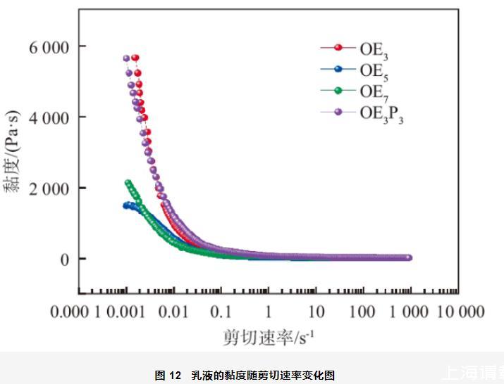 圖12為乳液的黏度隨剪切速率的變化圖。從圖中可以看出,4種乳液的黏度隨著剪切速率的增大而逐漸下降,說明這些乳液都呈現(xiàn)出剪切變稀體系;隨著剪切速率的繼續(xù)增加,其黏度不再下降而呈現(xiàn)一恒定值。這是因為這些乳液都形成了層狀液晶相,在外力剪切作用下,液晶的結(jié)構(gòu)極易被破壞,其微觀結(jié)構(gòu)單元會隨著剪切速率的增大而調(diào)整方向,當(dāng)體系內(nèi)微觀結(jié)構(gòu)單元的取向與剪切方向一致或者平行,就會導(dǎo)致體系黏度的下降;繼續(xù)增大剪切速率,液晶內(nèi)部微觀結(jié)構(gòu)單元取向基本都與剪切方向保持一致或平行,其黏度不再變化。從圖中還可以看出,當(dāng)剪切速率較低時,以O(shè)E3和OE3P3為乳化劑制備的乳液的黏度幾乎是以O(shè)E5和OE7為乳化劑制備的乳液黏度的3倍,這可能是因為前者形成的是“馬耳他十字”花紋的液晶結(jié)構(gòu),而后者是纖維狀的液晶結(jié)構(gòu)。4種乳液良好的剪切變稀特性使其在儲存期間保持較高的黏度,而在較高的剪切速率下又具有良好的流動性,便于生產(chǎn)和使用。