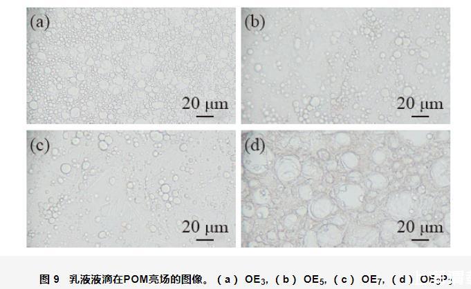 圖9(a)~(d)為分別以O(shè)E3、OE5、OE7和OE3P3為乳化劑制備的乳液液滴在POM亮場的圖像,可以發(fā)現(xiàn)球形液滴分散在連續(xù)的水相中,且以O(shè)E3為乳化劑形成的乳液具有均勻、細(xì)小的液滴。通過測定乳液液滴的粒徑分布可知,分別以O(shè)E3、OE5、OE7和OE3P3為乳化劑形成的乳液液滴的平均粒徑為3.65,3.95,4.66和15.34μm,即隨著OEn中EO加合數(shù)的增加,乳液粒徑的尺寸逐漸增大,且當(dāng)在OE3中引入PO基團后,乳液的粒徑明顯增大且達(dá)到最大值。這可能是因為在乳液的形成過程中,油醇烷氧基化物表面活性劑分子在油/水界面定向排列可以增加液體石蠟在水中的分散性,使得液體石蠟油滴均勻分散在水中,形成細(xì)小的液滴,且表面活性劑分子定向排列形成的乳化膜可以防止乳液液滴聚并,從而可以使乳液保持較小的粒徑。但隨著油醇烷氧基化物分子結(jié)構(gòu)中卷曲的EO鏈增長和支化的PO鏈的引入使得其在油/水界面的排列結(jié)構(gòu)不夠緊密導(dǎo)致乳液粒徑變大。