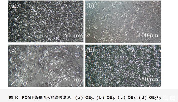 對制備的乳液在POM暗場進(jìn)行了觀察,液晶乳液的結(jié)構(gòu)紋理圖如圖10所示。由圖10可知,隨著OEn中EO加合數(shù)的增加,乳液液晶結(jié)構(gòu)的紋理由“馬耳他十字”花紋向纖維狀轉(zhuǎn)變;當(dāng)在OE3中引入PO基團后,乳液液晶結(jié)構(gòu)的紋理依然呈“馬耳他十字”花紋狀。但對比圖10(a)和(d)發(fā)現(xiàn),以O(shè)E3P3作為乳化劑形成的液晶結(jié)構(gòu)尺寸要大于以O(shè)E3為乳化劑形成的液晶。“馬耳他十字”花紋和纖維狀液晶結(jié)構(gòu)紋理說明4種乳液中都存在著層狀液晶。
