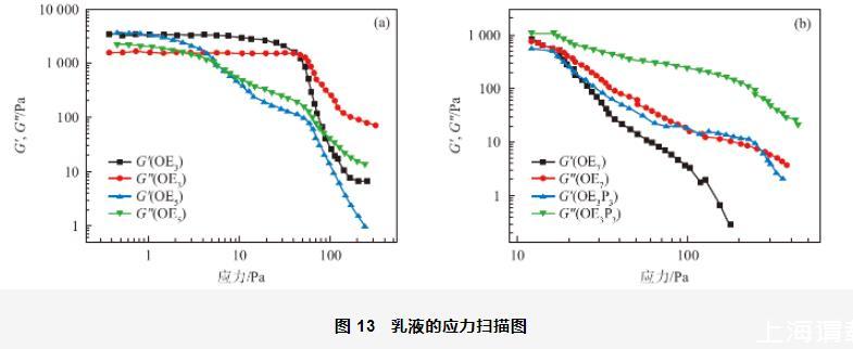 4種乳液的應(yīng)力掃描結(jié)果如圖13所示。從圖13(a)中可以看出,以O(shè)E3和OE5為乳化劑制備的乳液存在線性黏彈區(qū),當(dāng)應(yīng)力低于屈服應(yīng)力時,乳液的彈性模量(G')大于黏性模量(G''),表明乳液主要以不穩(wěn)定的彈性形式存在,乳液的不穩(wěn)定性主要與大量的水和液體石蠟有關(guān);當(dāng)應(yīng)力大于屈服應(yīng)力時,G'和G''都開始降低,說明乳液內(nèi)部的微觀結(jié)構(gòu)發(fā)生了一定程度的破壞。從圖13(a)還可發(fā)現(xiàn),以O(shè)E3為乳化劑制備的乳液比以O(shè)E5為乳化劑制備的乳液的線性黏彈區(qū)寬,說明前者乳液的穩(wěn)定性較強,體系不容易沉降或者分層。從圖13(b)中可以看出,以O(shè)E7和OE3P3為乳化劑制備的乳液在測定的應(yīng)力范圍內(nèi)不存在線性黏彈區(qū),當(dāng)應(yīng)力接近10 Pa時,兩種溶液的G'和G''就開始降低,即乳液結(jié)構(gòu)遭到了破壞。根據(jù)應(yīng)力掃描結(jié)果發(fā)現(xiàn),以O(shè)E3為乳化劑制備的乳液的穩(wěn)定性明顯強于其它3種乳液,這可能是因為,當(dāng)分別以O(shè)E5、OE7和OE3P3為乳化劑時,由于其分子結(jié)構(gòu)中長的、卷曲的EO鏈和支化的PO鏈在液滴表面形成的界面層不夠穩(wěn)定所致。