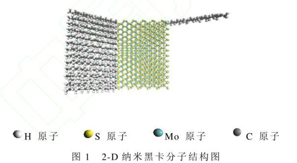 2-D納米黑卡具有雙層結(jié)構(gòu),由大小為30?×40?×12?的二硫化鉬納米片與直鏈烷烴構(gòu)成。假設(shè)理想狀態(tài)下二硫化鉬納米片無晶格缺陷,其活性位點位置確定可參見文獻(xiàn),且全部被C18H38直鏈烷烴接枝,如圖1所示。