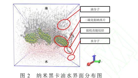 計算水分子、油相分子和納米黑卡之間的相互作用,截斷半徑分別為10?和12?。所構(gòu)建的油水界面體系由31 500個油分子和17693個水分子組成,并將納米黑卡置于所構(gòu)建的油水界面體系中。如圖2所示,油水界面上層部分的碳?xì)滏湵硎居头肿樱退缑嫦聦訁^(qū)域代表水分子。