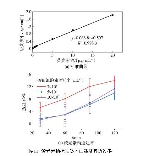 標(biāo)記物跨膜通量的測(cè)定也可以反映單層細(xì)胞膜的完整性,熒光素鈉標(biāo)準(zhǔn)吸收曲線及其在不同時(shí)間段的透過率見圖11。由圖11(a)的熒光素鈉的標(biāo)準(zhǔn)曲線方程中,代入BL側(cè)的吸光度,可計(jì)算出BL側(cè)的熒光素鈉質(zhì)量,根據(jù)式(4),即可得出不同時(shí)間段的熒光素鈉透過率[圖11(b)]。由圖11(b)可知,孵育2 h后,3個(gè)不同初始密度的細(xì)胞模型均對(duì)熒光素鈉具有一定的透過性。初始細(xì)胞密度為3×105個(gè)/mL的細(xì)胞模型對(duì)熒光素鈉的透過率相對(duì)較高,達(dá)到13.96%;初始AP側(cè)加入熒光素鈉的密度為20μg/mL,最終3種模型的熒光素鈉透過量均小于0.011 6μg/min,說明3種細(xì)胞模型單層膜的致密性能良好。