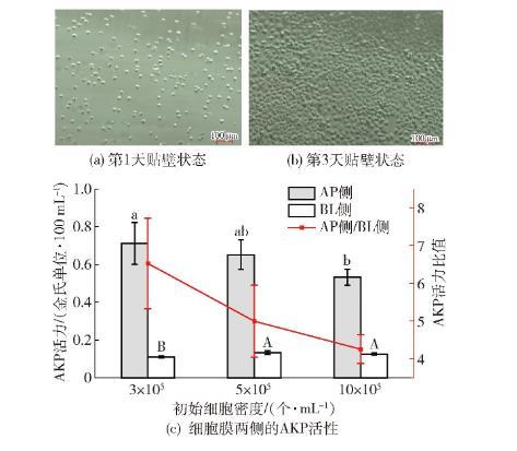 Caco-2細(xì)胞培養(yǎng)狀態(tài)及培養(yǎng)21 d后的堿性磷酸酶活性見圖10。由圖10(a)、(b)可以發(fā)現(xiàn),培養(yǎng)3 d過程中,單層Caco-2細(xì)胞生長(zhǎng)穩(wěn)定并均勻分布在Transwell上,貼壁情況良好。堿性磷酸酶AKP是小腸刷狀緣細(xì)胞的標(biāo)志酶,其濃度代表了單層Caco-2細(xì)胞的極化和功能。觀察圖10(c)可知,培養(yǎng)21 d后,不同接種細(xì)胞密度在AP側(cè)的酶活性均高于BL側(cè)的酶活性,屬正常的細(xì)胞極化結(jié)果。初始密度為3×105個(gè)/mL的細(xì)胞AP側(cè)的AKP活性高于其他兩組,其BL側(cè)的AKP活性低于其他兩組,證明該組細(xì)胞分化情況較好。隨著細(xì)胞密度的增大,AP側(cè)與BP側(cè)活力的比值呈下降趨勢(shì),說明初始細(xì)胞密度過大不利于細(xì)胞的分化。實(shí)驗(yàn)結(jié)果表明,3種模型細(xì)胞均生長(zhǎng)良好。
