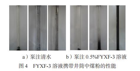 由圖4a)看出,裝有清水的有機玻璃管底部的煤粉沒有被懸浮,且泵注后,排出液中幾乎沒有攜帶出煤粉。由圖4b)看出,裝有0.5%FYXF-3溶液的有機玻璃管底部的煤粉被懸浮,且泵注后,排出液為黑色渾濁液體,攜帶出煤粉質(zhì)量為0.25g??梢钥闯觯瑵舛葹?.5%的FYXF-3溶液對煤粉的懸浮性能較好,可以將井筒堆積的韓城現(xiàn)場煤粉懸浮,并隨著返排液返排至地面。