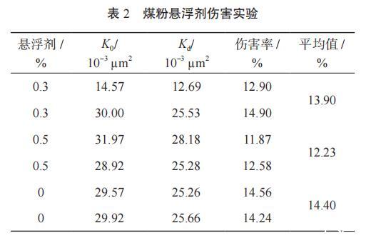表2煤粉懸浮劑傷害實(shí)驗(yàn)