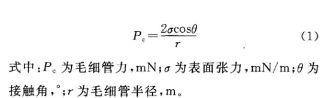 式中:Pc為毛細管力,mN;σ為表面張力,mN/m;θ為接觸角,°;r為毛細管半徑,m。