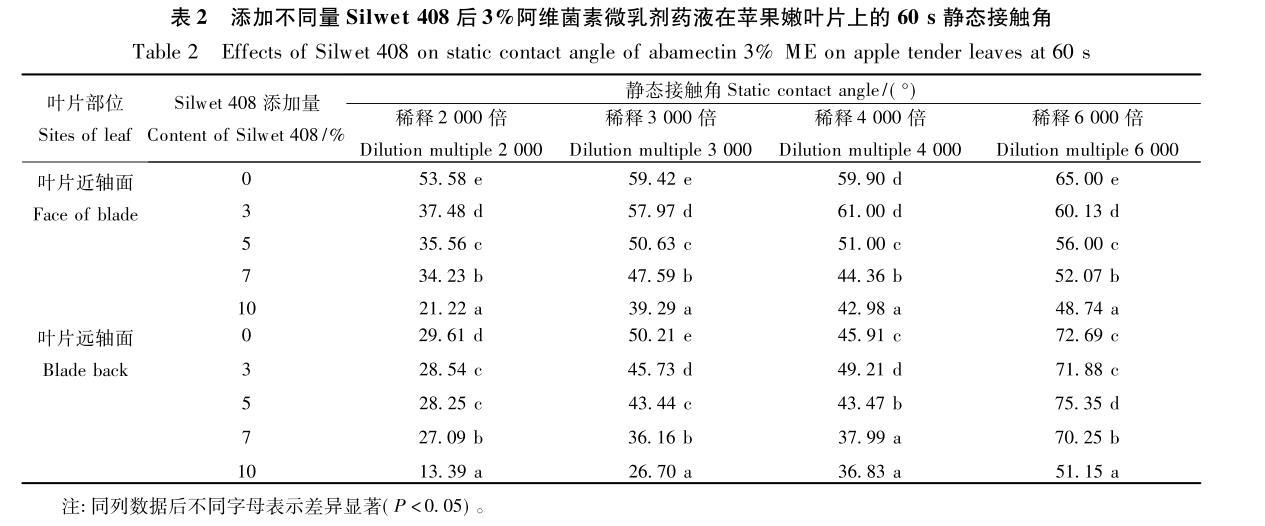 本研究表明,3%阿維菌素微乳劑中添加Silwet 408可顯著降低藥液表面張力及其在蘋果葉片上的接觸角,且表面張力和接觸角的變化與助劑添加量和葉片的狀態(tài)相關(guān)。因此在實際生產(chǎn)中,應根據(jù)害蟲為害的部位及葉片狀態(tài)等,有針對性地選擇適宜的表面活性劑及其添加量。