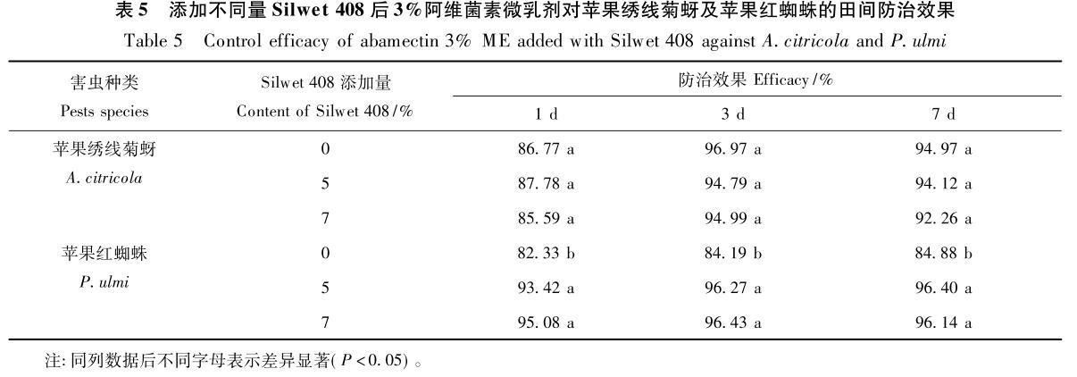 綜合表面張力、接觸角及室內(nèi)毒力測定結(jié)果,選擇Silwet408添加量分別為5%和7%的阿維菌素微乳劑藥液進行了田間防效試驗。結(jié)果(表5)與室內(nèi)毒力試驗結(jié)果規(guī)律基本一致:添加Silwet408對提高阿維菌素微乳劑對蘋果紅蜘蛛田間防治效果作用顯著,而對蘋果繡線菊蚜防效的影響則不明顯,再次證明Silwet408雖可有效降低阿維菌素微乳劑的表面張力和接觸角,但卻未必一定能提高其對不同害蟲的防效。